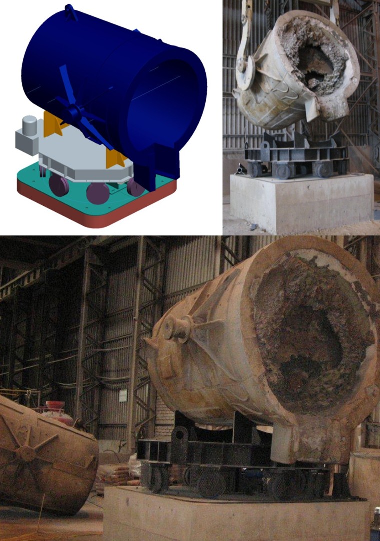 A need arose at a manufacturing facility to design, fabricate, and supply a mechanism to rotate ladles during cleaning operations. Accumulated slag inside the ladles reduced their capacity, necessitating periodic cleaning with a hydraulic hammer mounted on a tractor loader backhoe (TLB). Due to spatial constraints within the plant, rotating the ladles by 90 degrees was essential to provide adequate access for the TLB. The existing cranes were unable to rotate tilted ladles, creating the requirement for a specialized turntable solution.